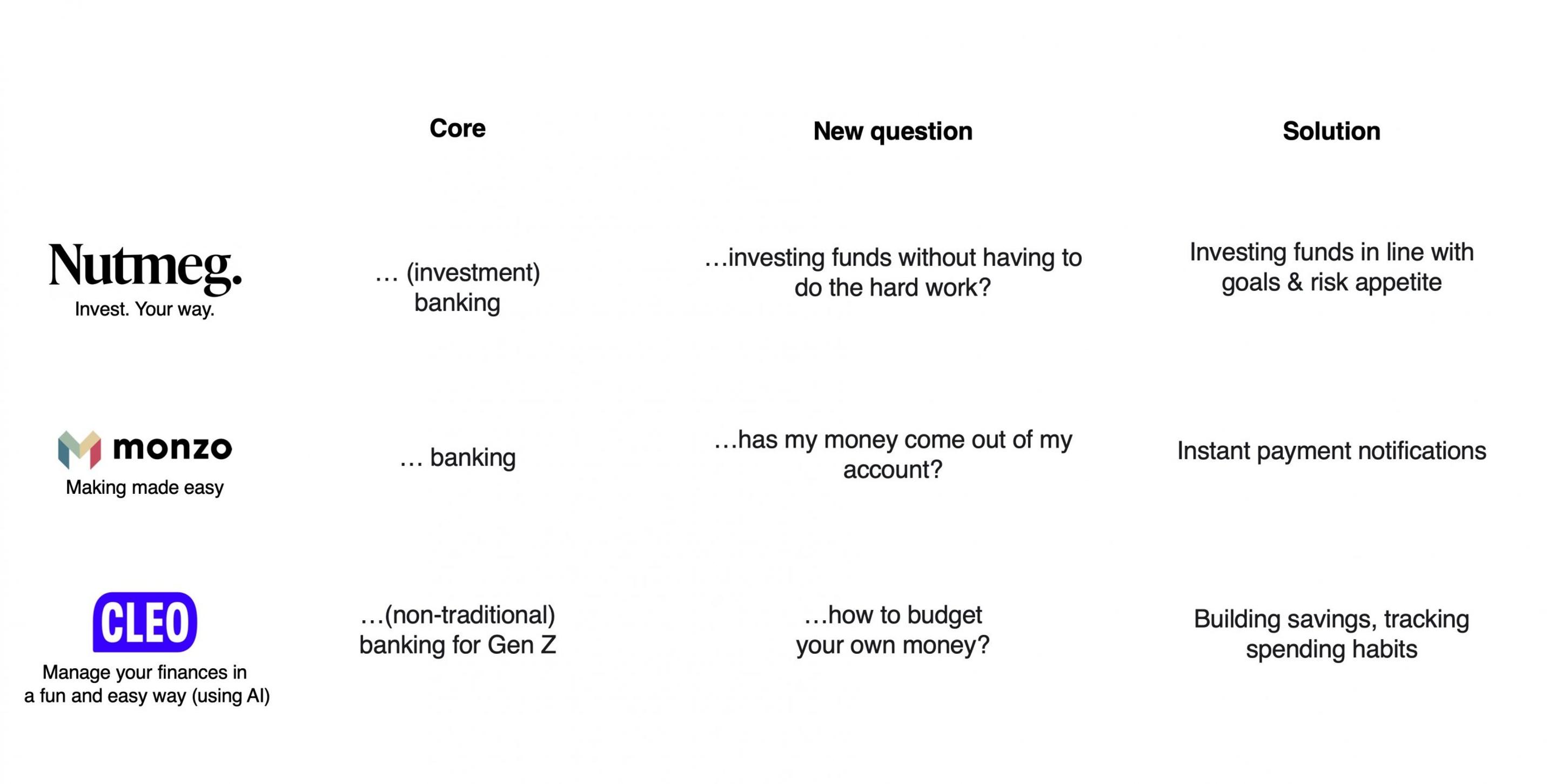 Products that stick, create habits, and exceed expectations do so by answering new questions. When you look at the core of some great digital products, it's easy to understand. They each found a new question to answer and addressed this through an elegant solution as shown below.